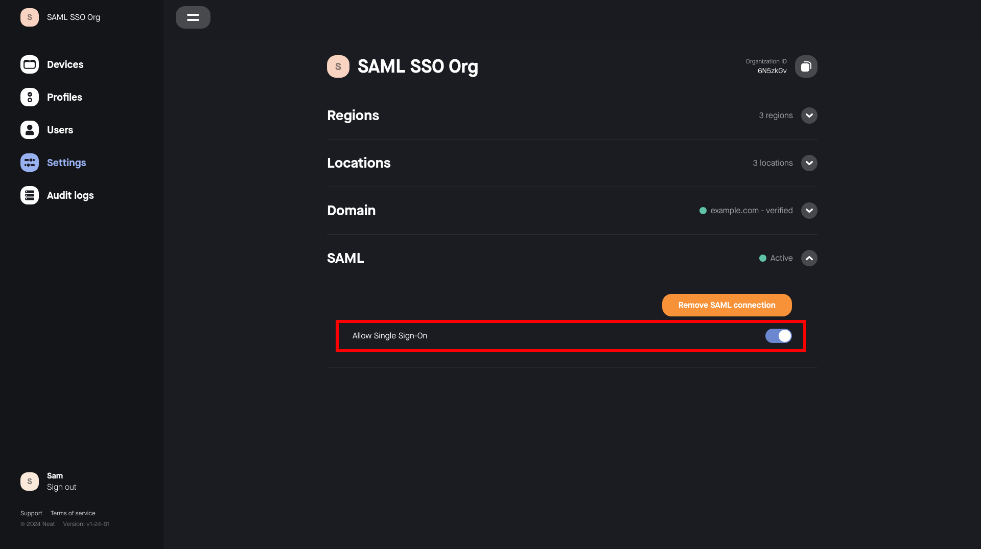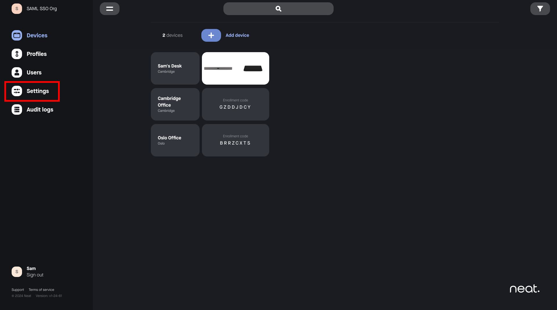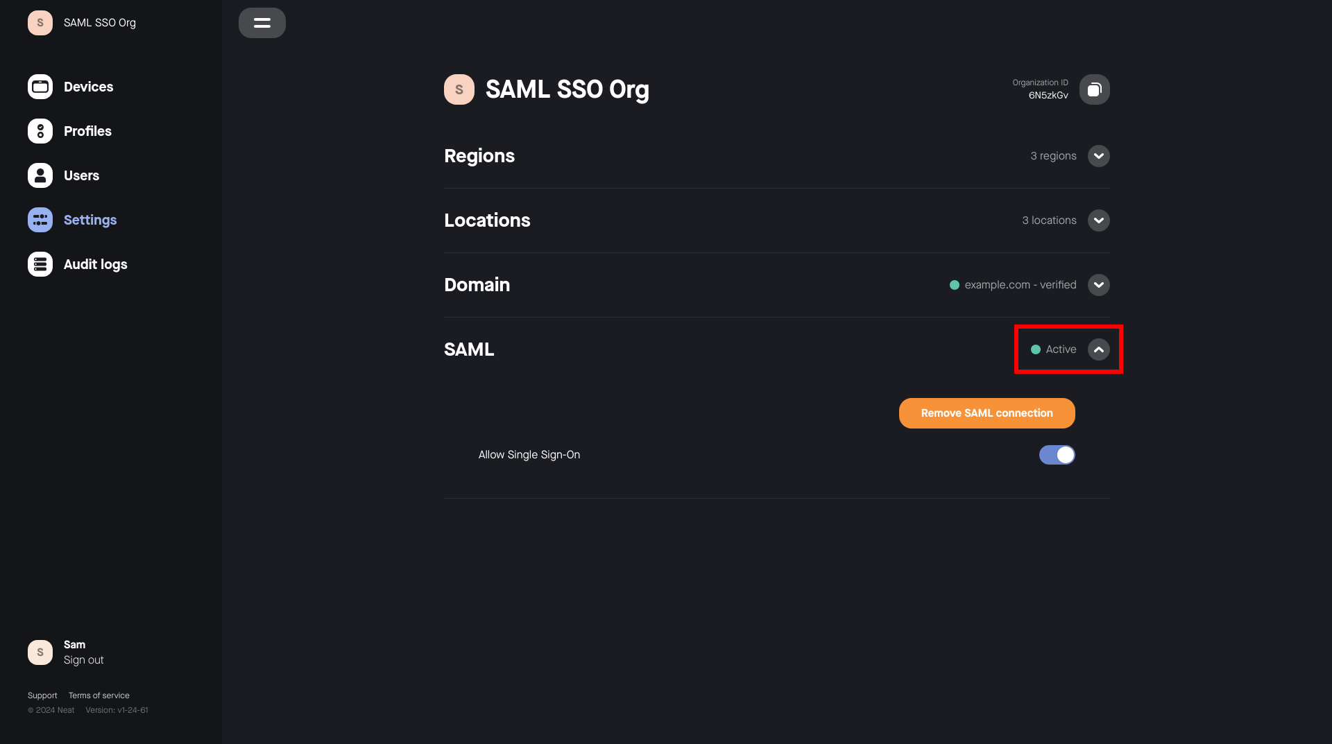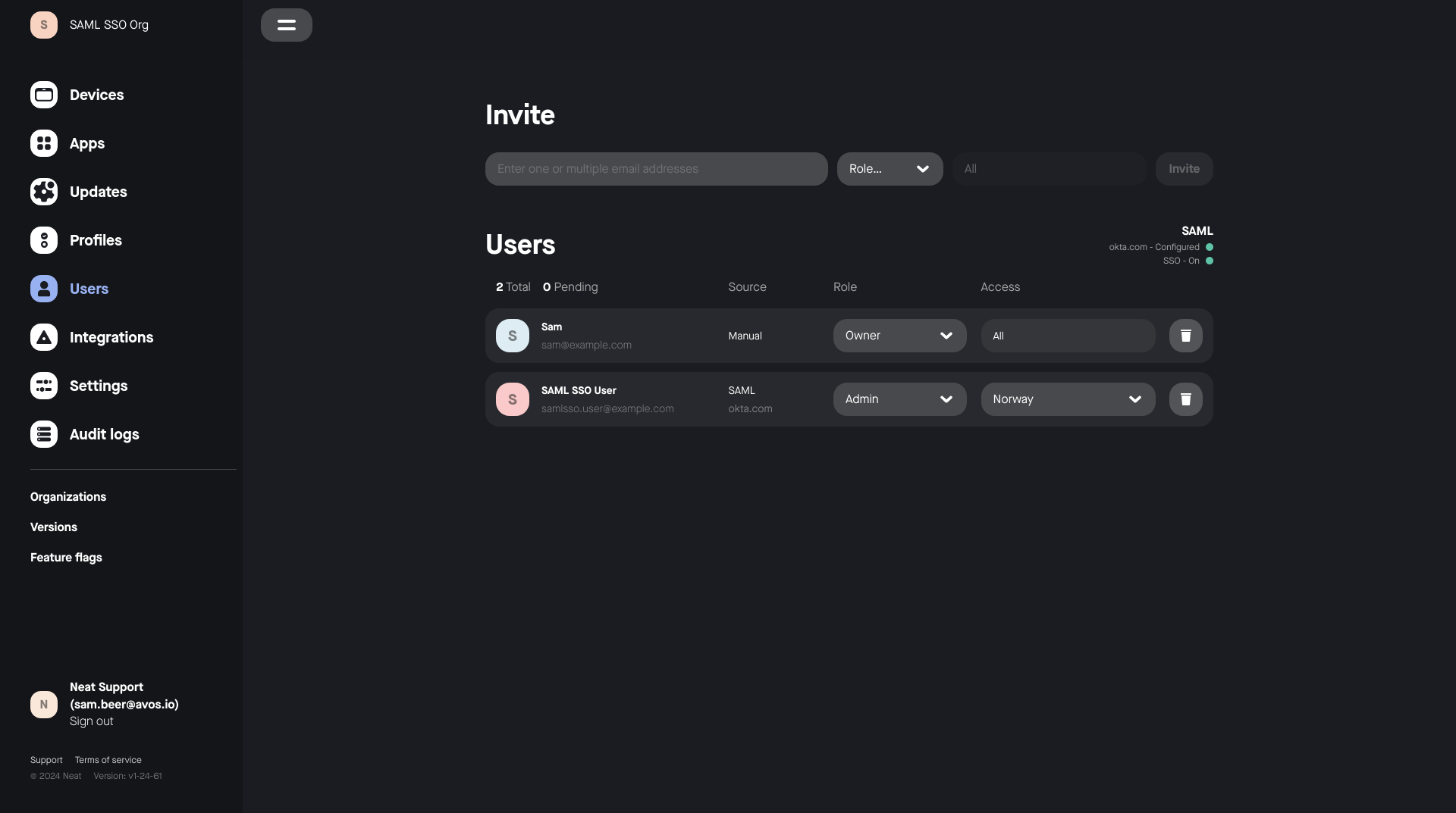 To manage user access securely and at scale, Neat Pulse allows you to set up SAML-based