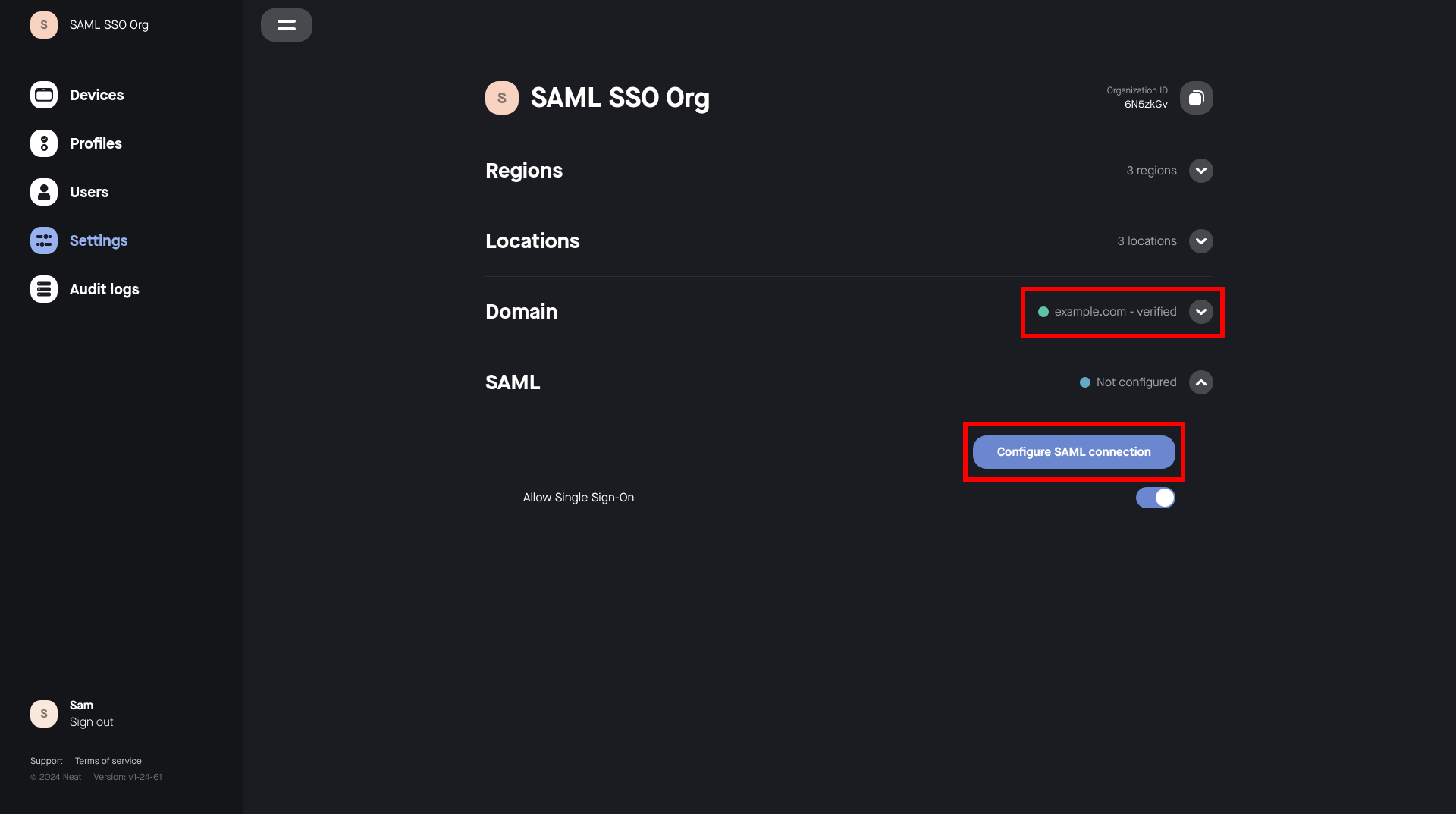 Neat Pulse organization. For example, if example.com is your Neat Pulse organization’s verified domain, user@example.com is a compatible email address for SAML SSO.