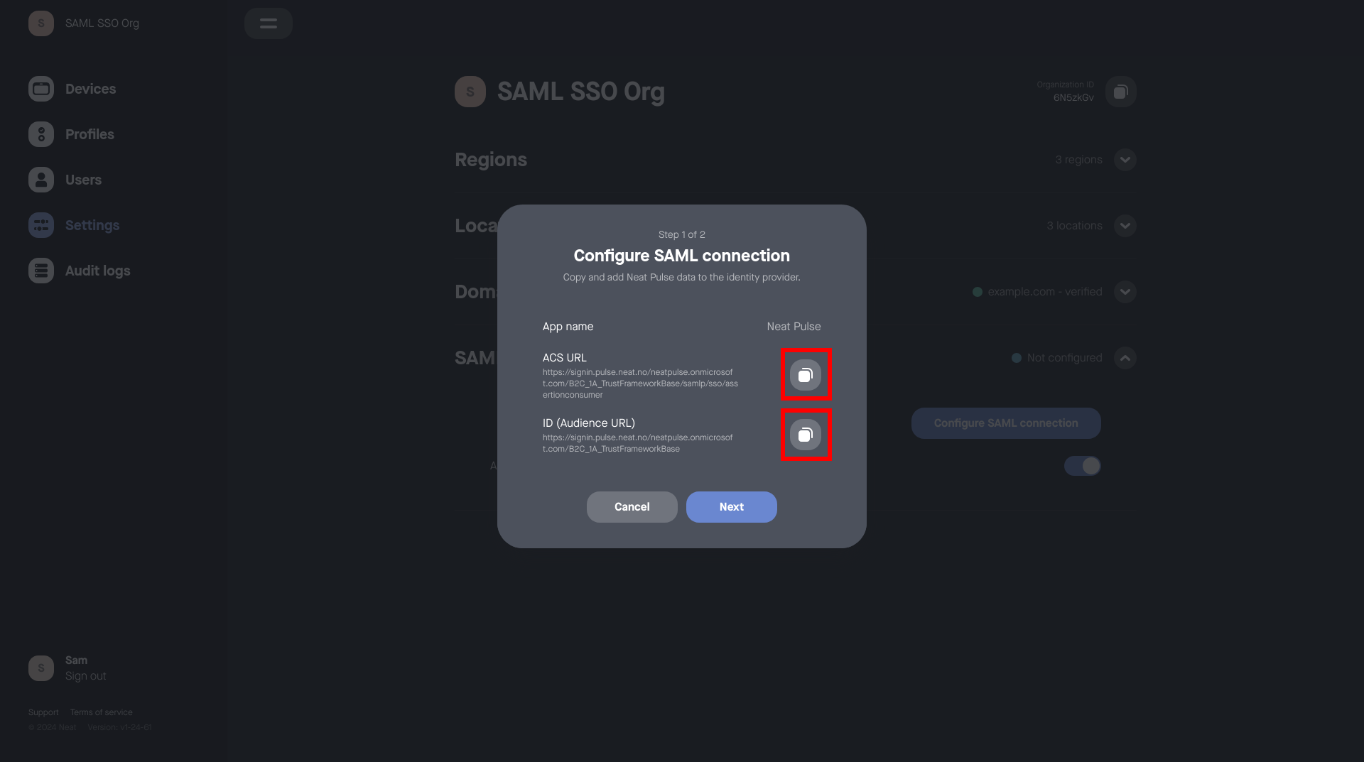 1. Copy the provided ACS URL and Entity ID from the popup window in Neat Pulse
