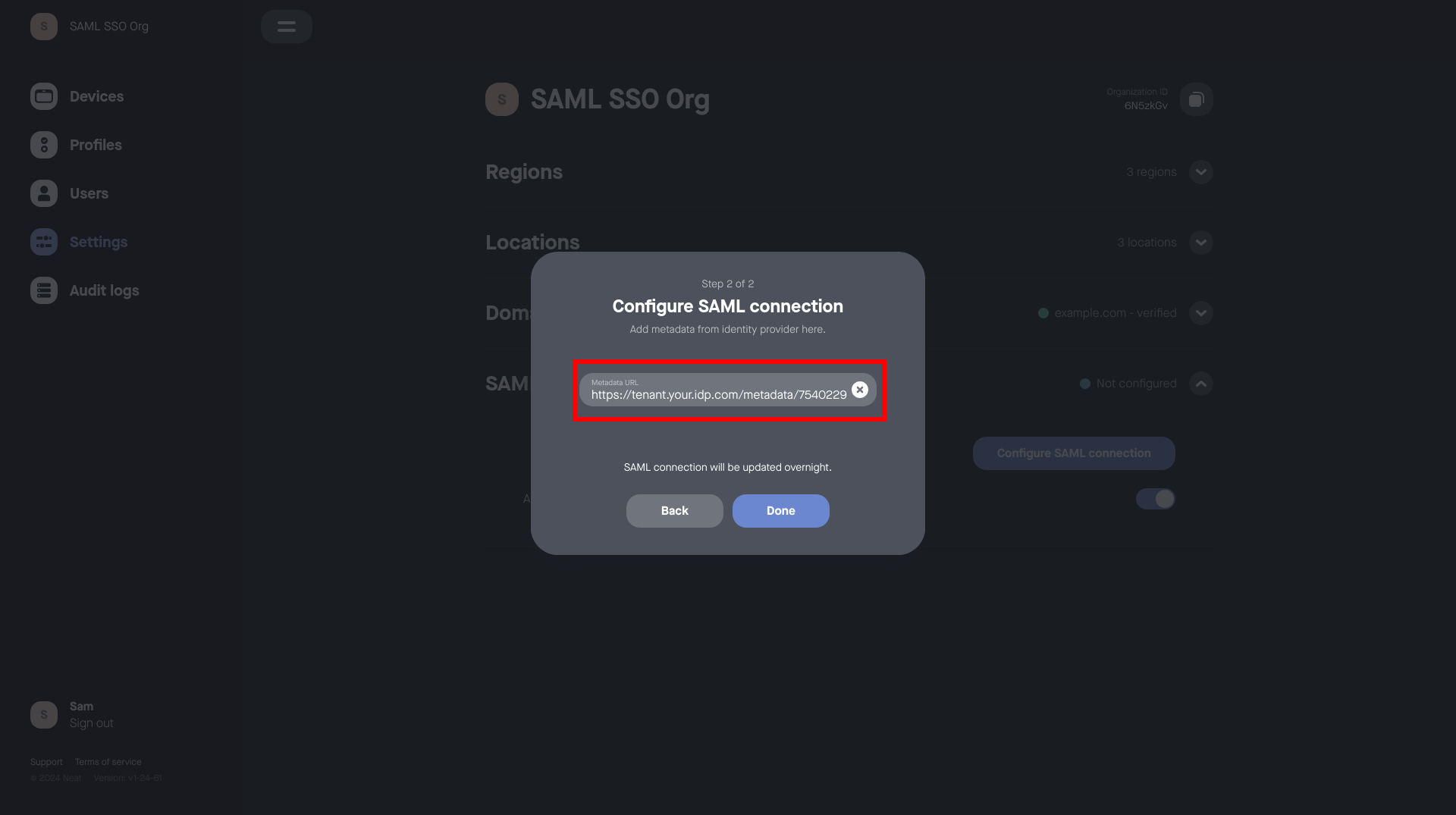 2. Wait for Neat Pulse to configure SAML SSO for your organization. (This will usually occur the following night in the GMT timezone.)