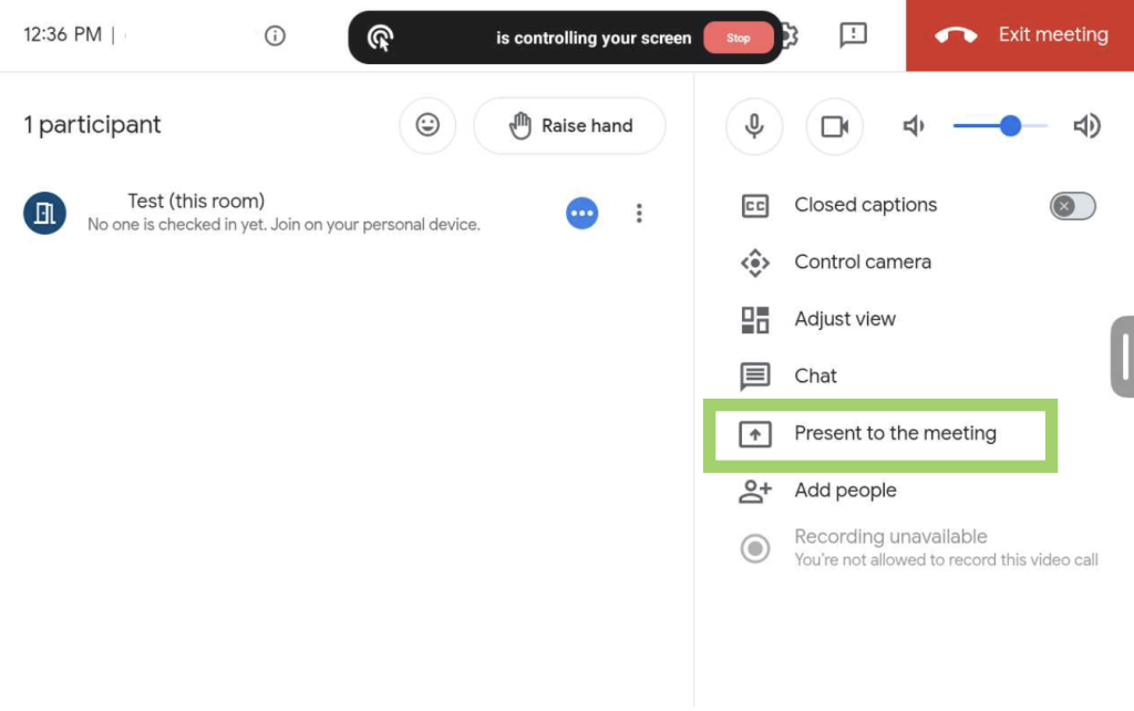 - Outside a meeting – On the Neat Pad as a controller, select Present to room only.