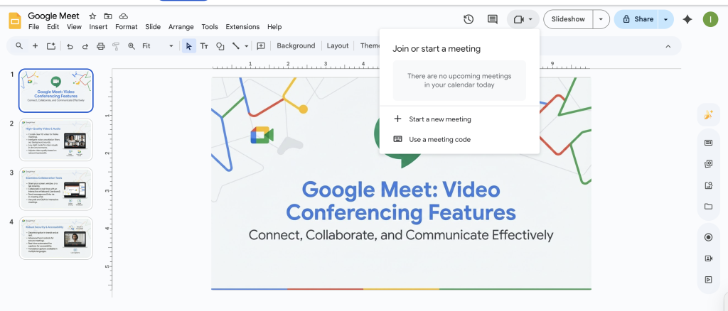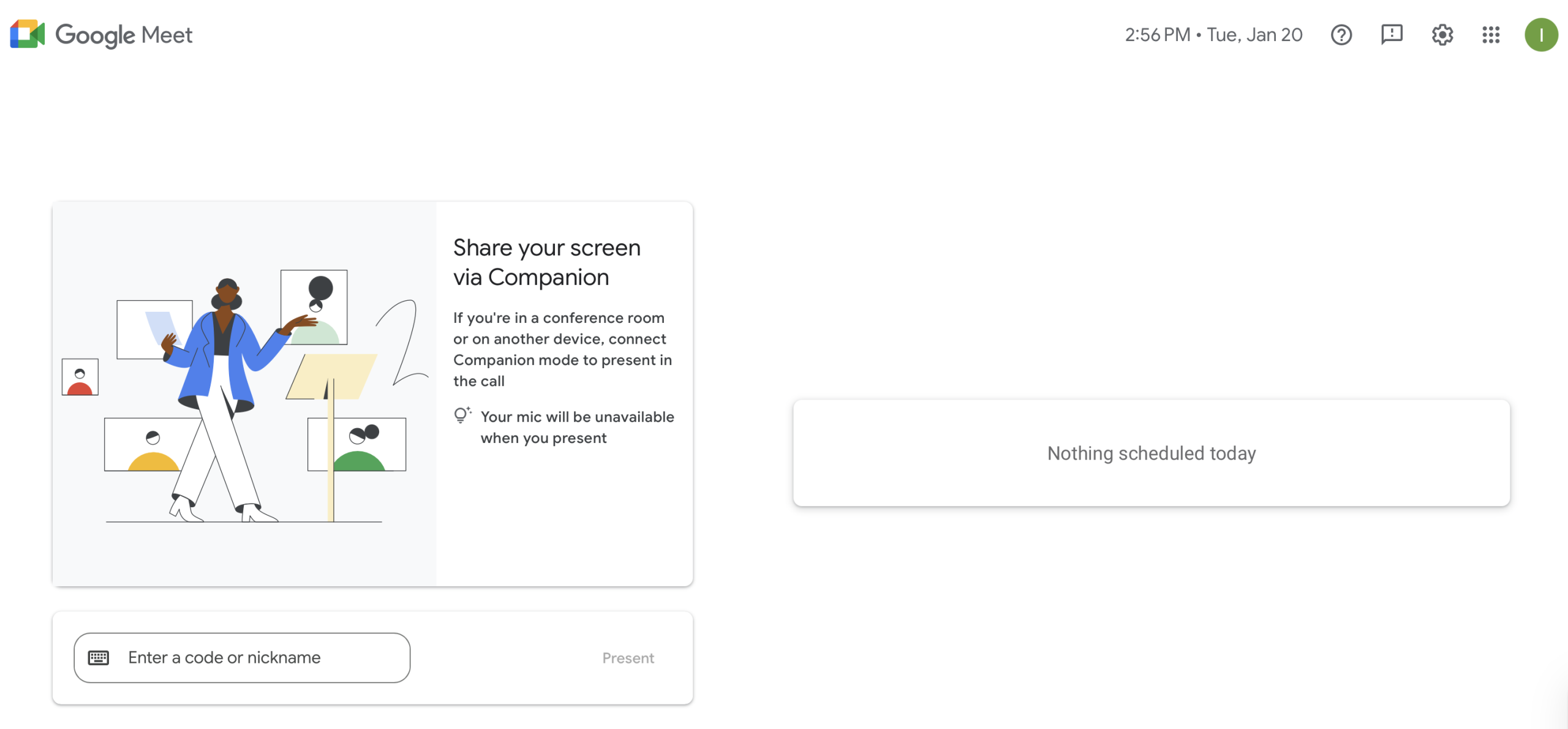 - On the Google Meet home screen, select a meeting and then choose what to share.