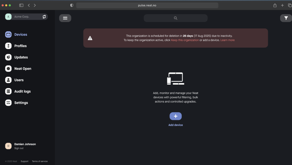 Starting from October 2025, to ensure that Neat Pulse stays secure, streamlined, and free of unused organizations, Pulse organizations that are considered inactive will be automatically deleted.