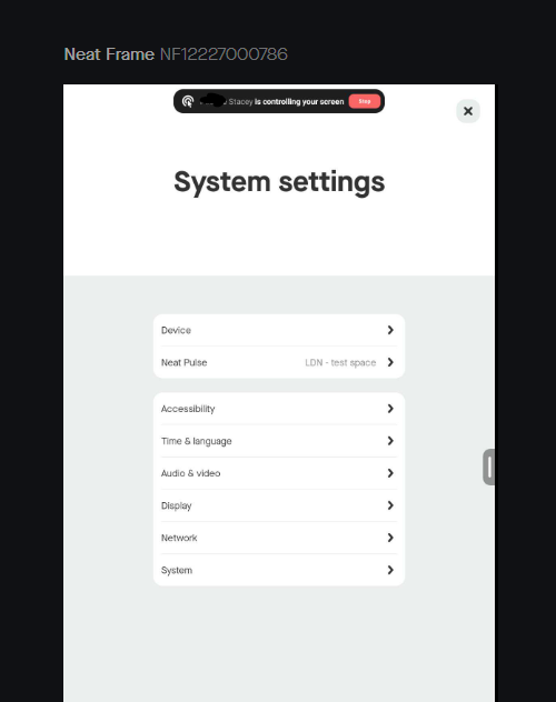 After your Neat device has been set up and enrolled in Neat Pulse, you can select whether or not you want to allow remote control on your device from the Neat Pulse menu in the device’s system settings. Go to Settings -> Device settings -> Neat Pulse -> Remote control.